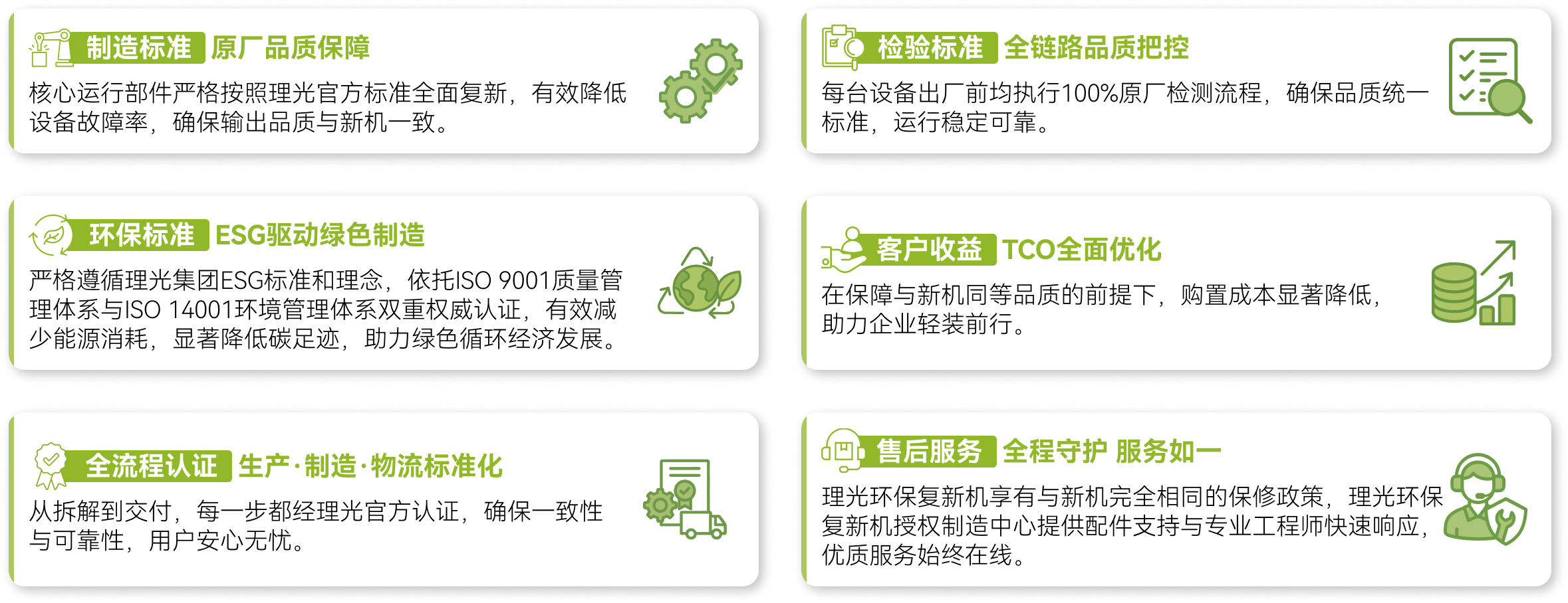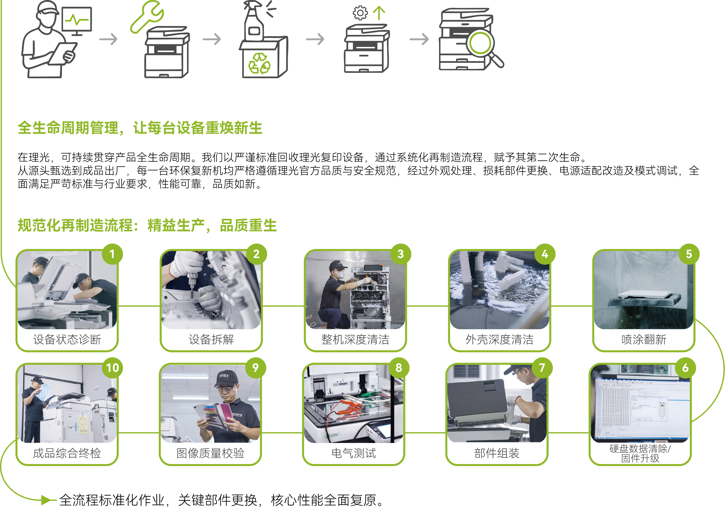 理光深知您对 “再生产品” 的顾虑,每一台环保复新机均来自理光品牌旧设备的
